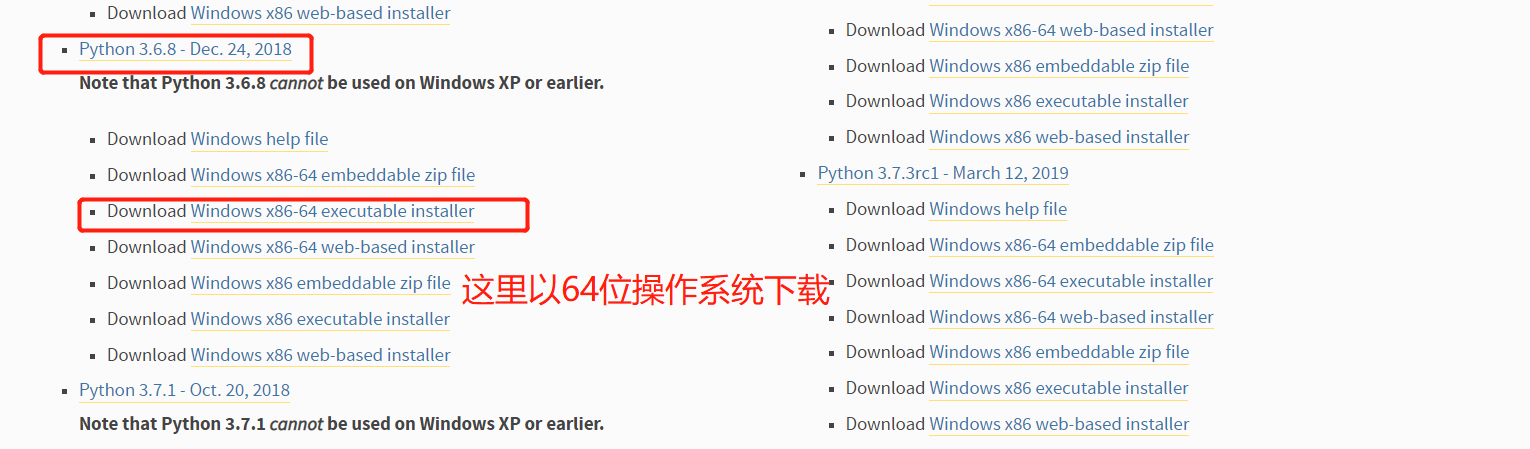 2. 到这个界面后往下滑,然后找到Python 3.6.8 - Dec.24,2018这个版本,64位的操作系统下载第二个,32位操作系统下载第六个。