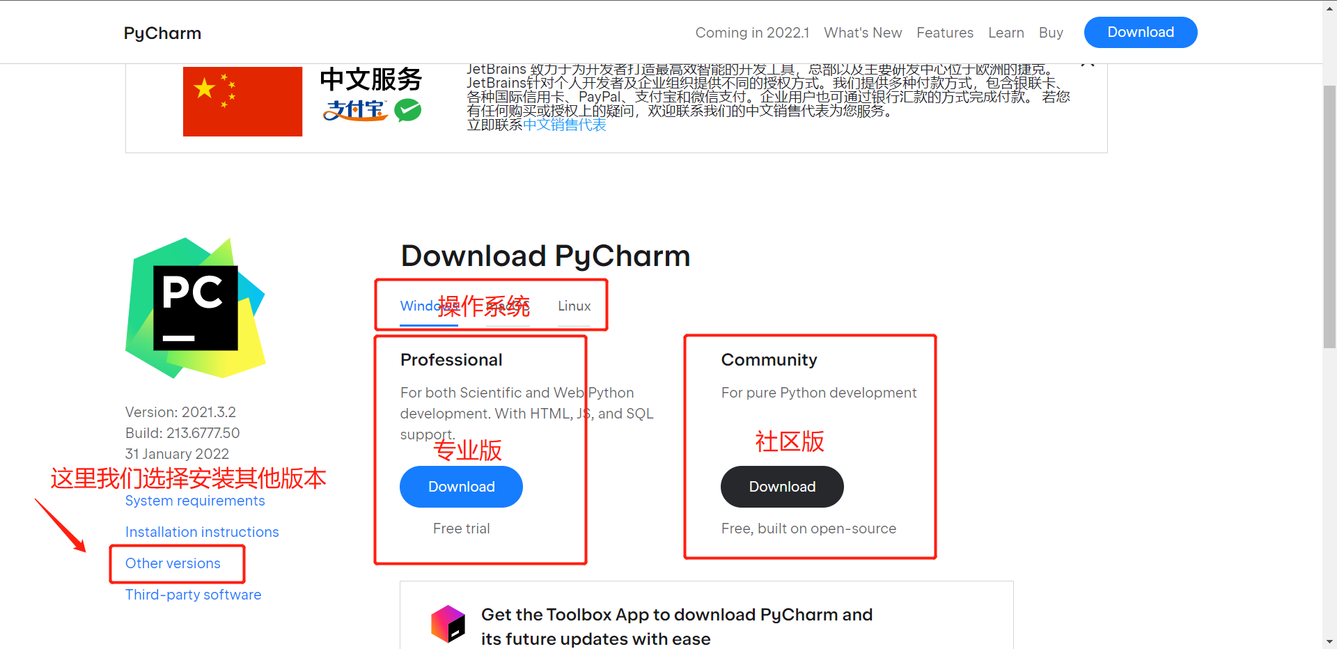 选择我们的操作系统,然后选择下载社区版(免费)或者专业版(收费,功能更全),