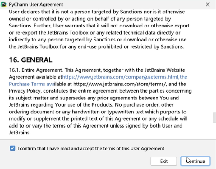 1.首先我们第一次打开pycharm,会弹出下面这个框,我们勾选协议同意然后点”continue“