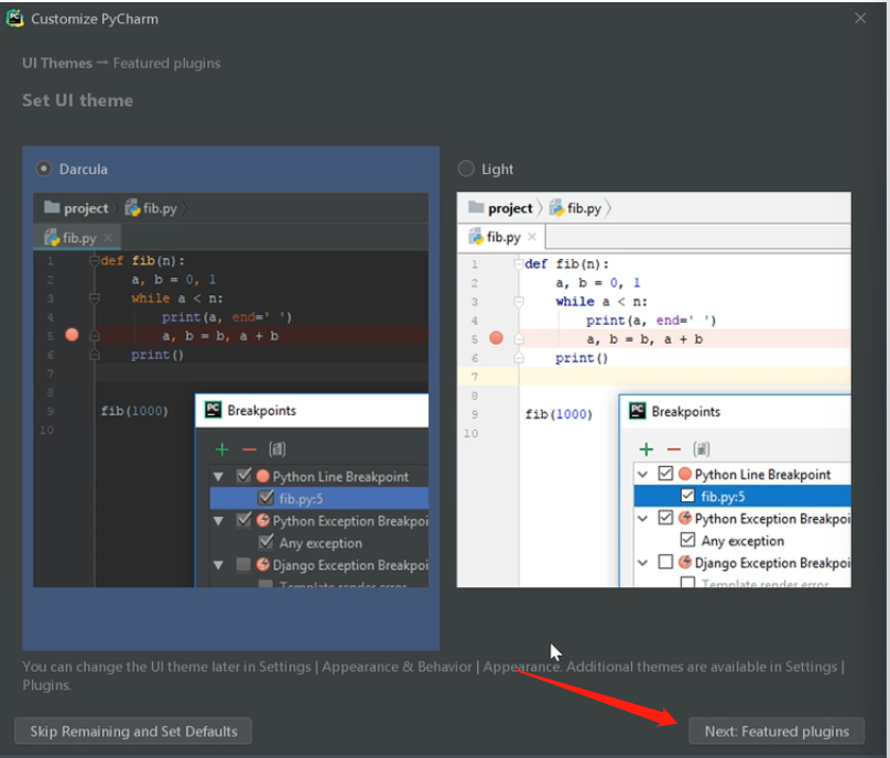 3.主题可以根据自己的需求来选择,建议选择深色主题,可以更换的保护我们的眼睛,然后点”next“