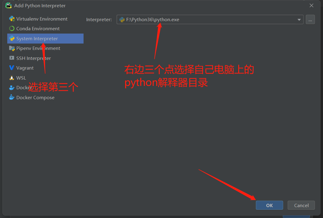 7.选择System Interpreter ,然后选择自己电脑上已安装的python解释器(上面有解释器的安装教程),点”ok“即可。