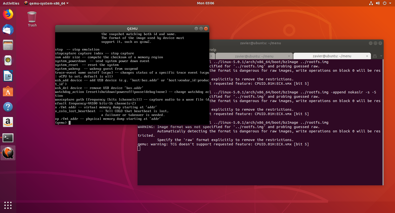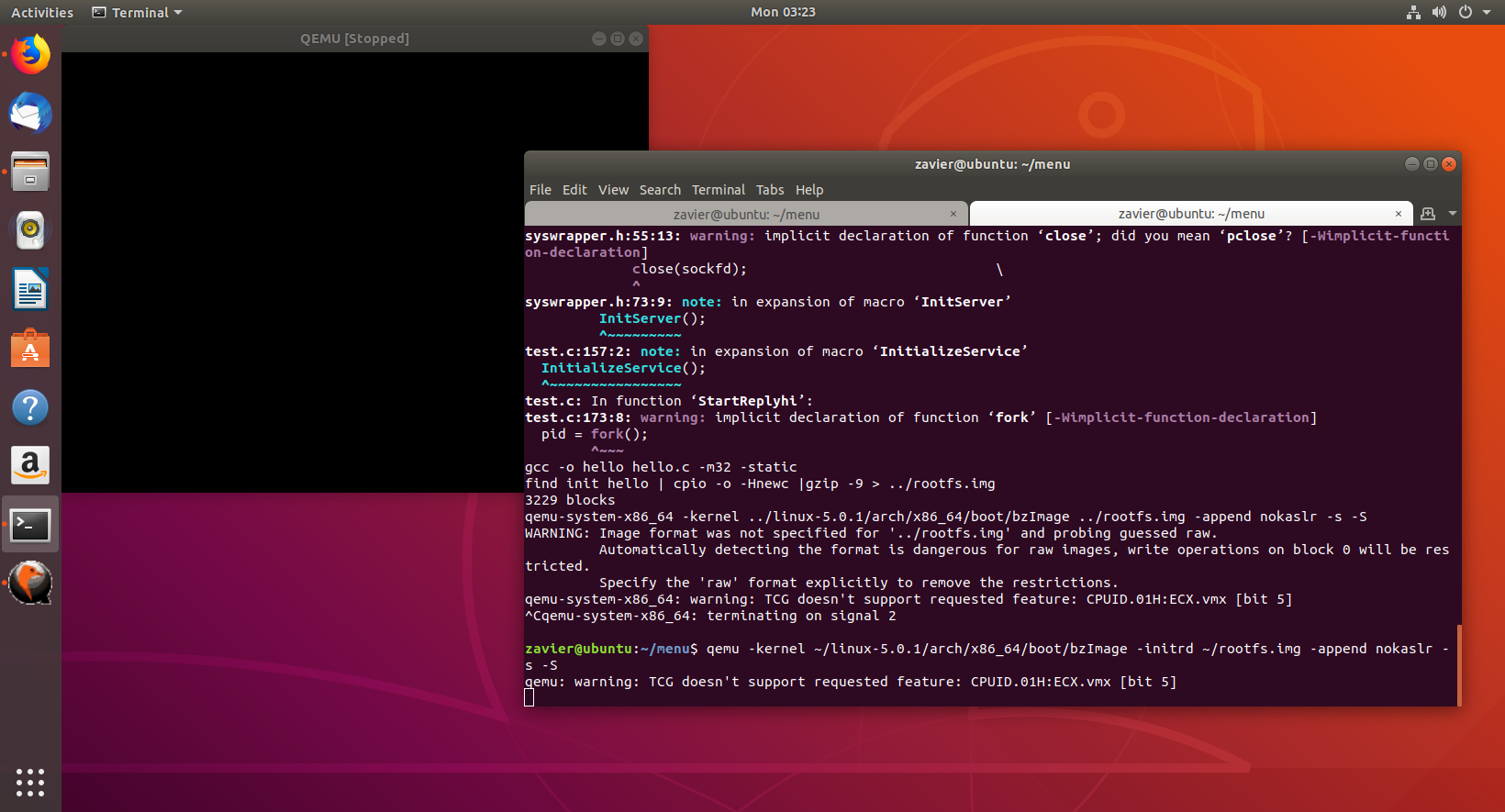 qemu -kernel ../linux-5.0.1/arch/x86_64/boot/bzImage -initrd ../rootfs.img