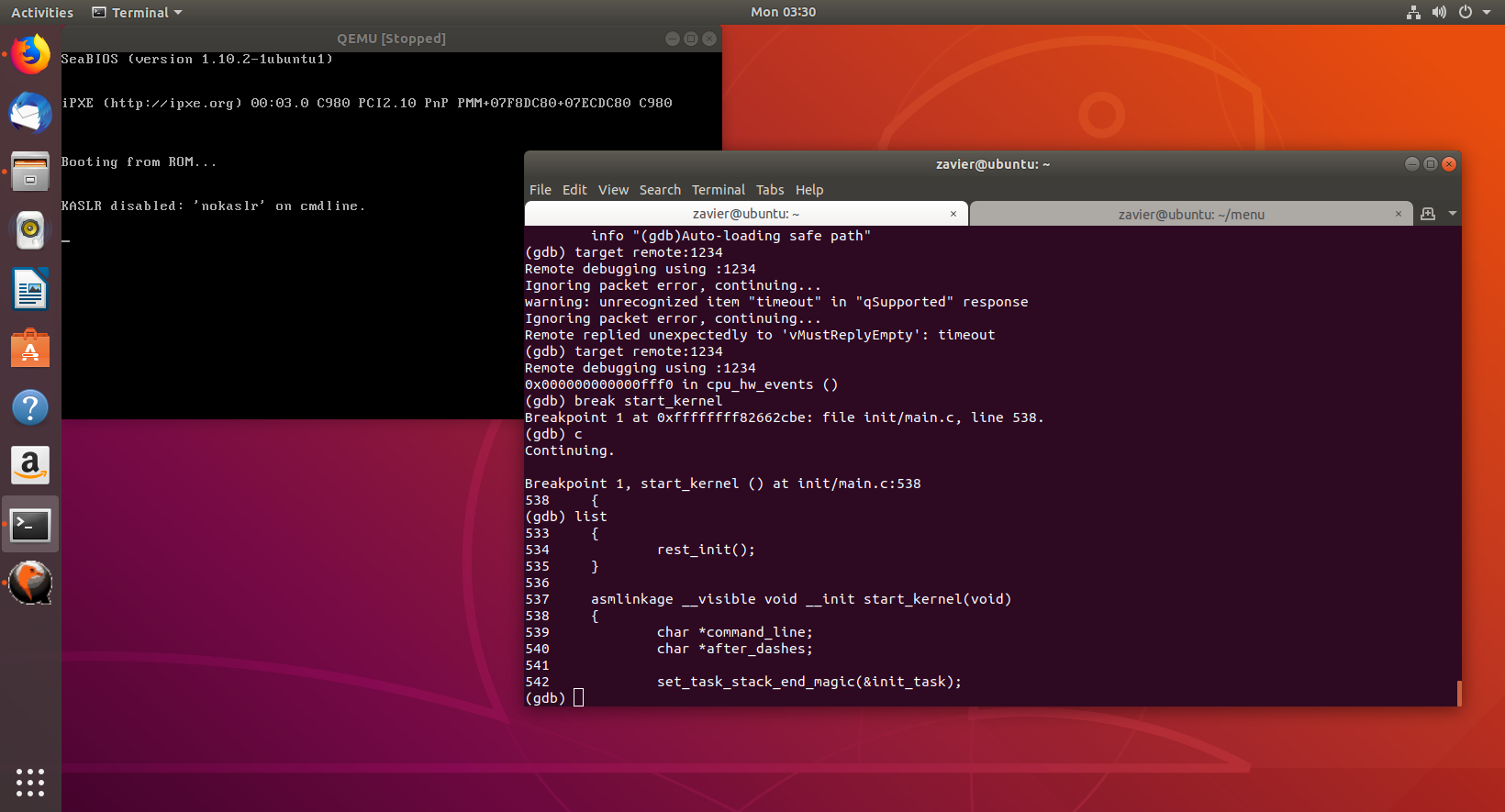 qemu -kernel ~/linux-5.0.1/arch/x86_64/boot/bzImage -initrd ~/rootfs.img -append nokaslr -s -S