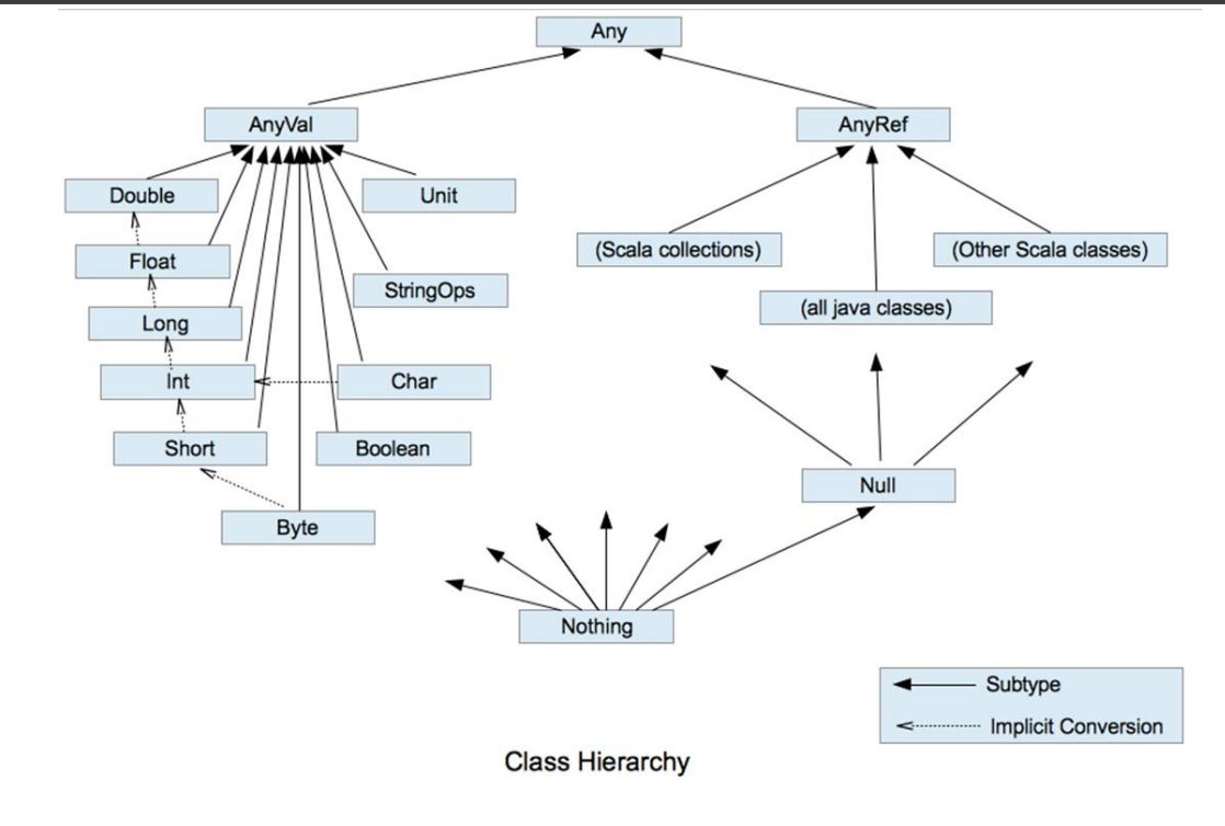 2. 在 scala 中类分为两个大的类型分支(AnyVal [值类型 ,即可以理解成就是 java 的基本数据类型], AnyRef 类型)。