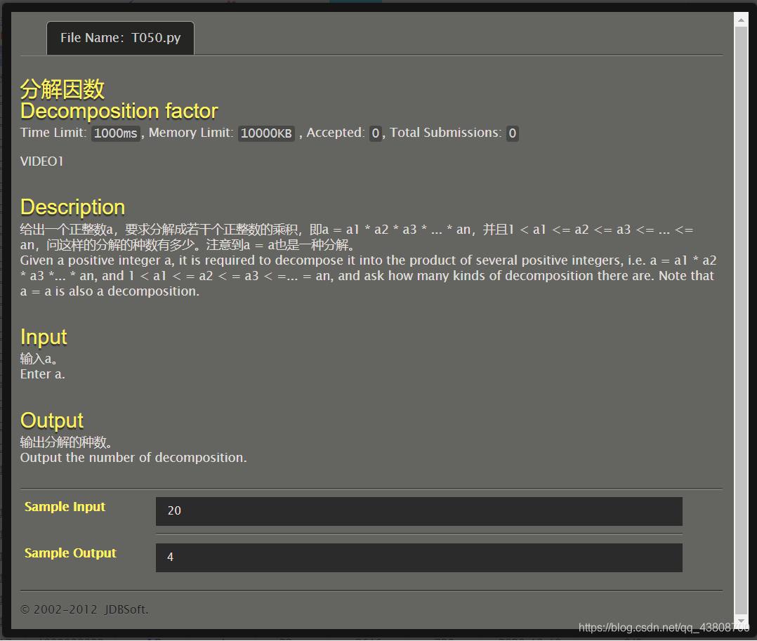 如 对20分解因数,从20,19,18,17...开始试 dfs(20,19),dfs(20,18)。。。