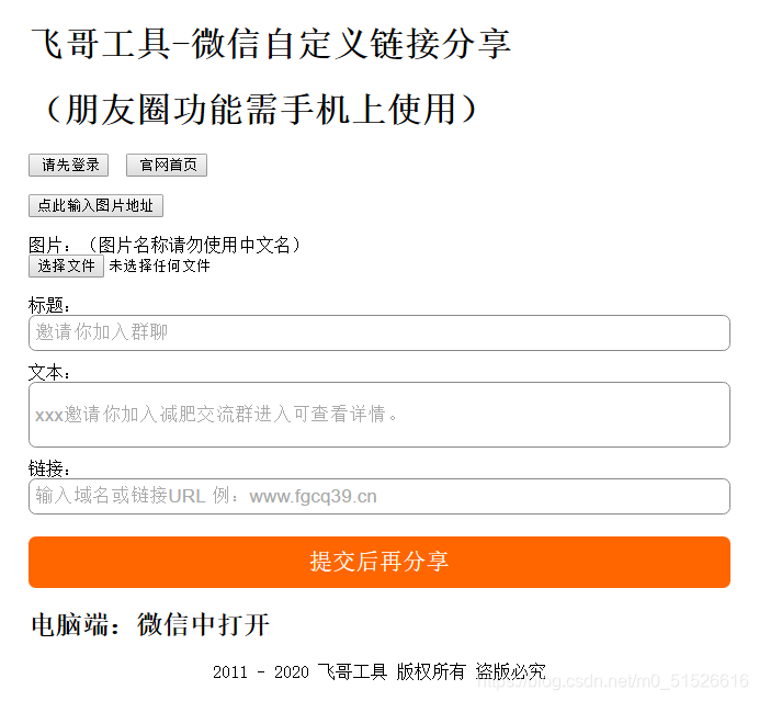 去这里填写信息后,点击生成后,填写标题,链接,描述和图标后,在微信环境下打开后,按右上角分享到好友或者群即可生成自定义跳转连接。