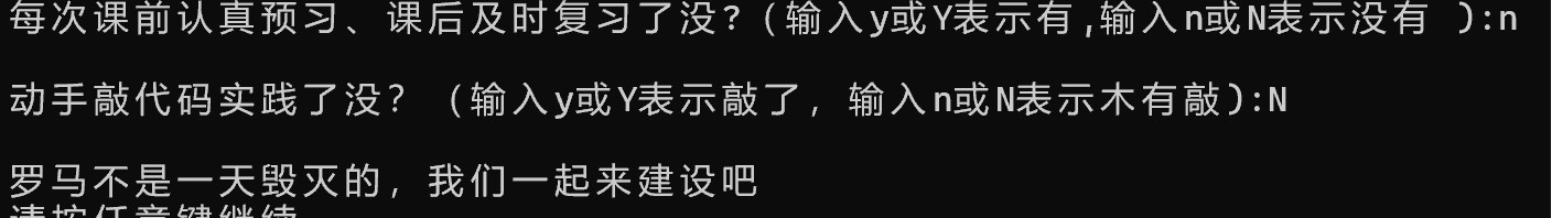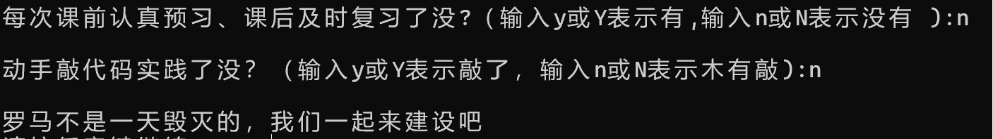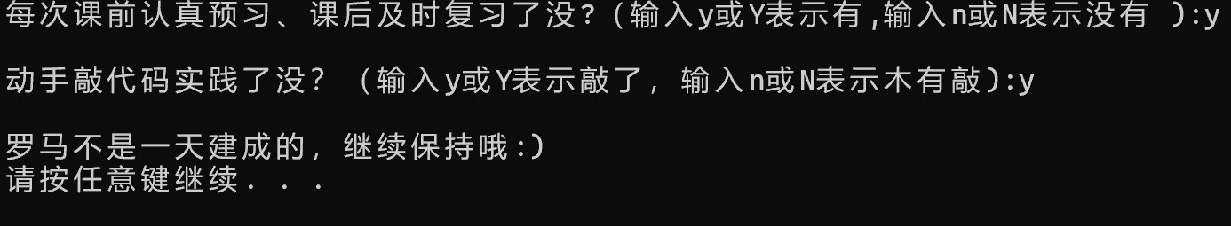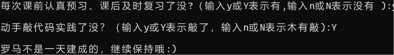 15 printf("\n罗马不是一天建成的,继续保持哦:)\n");
