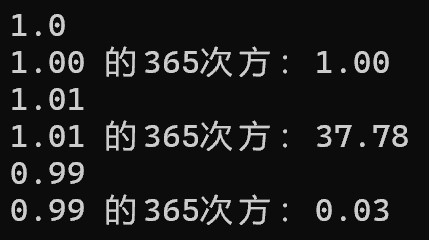 11 printf("%.2f 的365次方:%.2f\n",x,ans);