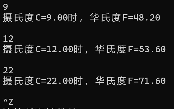 11 printf("摄氏度C=%.2lf时,华氏度F=%.2lf\n ",C,F);
