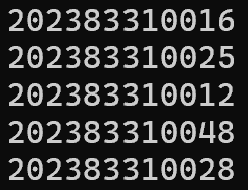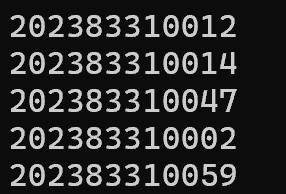 1 #include<stdio.h> 2 #include<stdlib.h> 3 #include<time.h> 4 #define N 5 5 6 int main() 7 { 8 int number; 9 int i; 10 srand(time(0));// 以当前系统时间作为随机种子 11 for(i=0;i<N;++i) 12 { number=rand()%65+1; //rand()取65余数(0~64)后加一-->生成1~65 13 printf("20238331%04d\n",number); 14 } 15 system("pause"); 16 return 0; 17 }