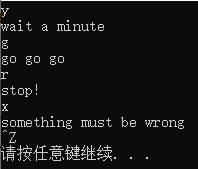 1 #include<stdio.h> 2 #include<stdlib.h> 3 int main() 4 { 5 char a; 6 while(scanf("%c",&a)!=EOF) 7 { 8 getchar(); 9 if(a== 'r') 10 { 11 printf("stop!\n"); 12 continue; 13 } 14 15 if(a=='g') 16 { 17 printf("go go go\n"); 18 continue; 19 } 20 if(a=='y') 21 { 22 printf("wait a minute\n"); 23 continue; 24 } 25 printf("something must be wrong\n"); 26 27 } 28 system("pause"); 29 return 0; 30 }