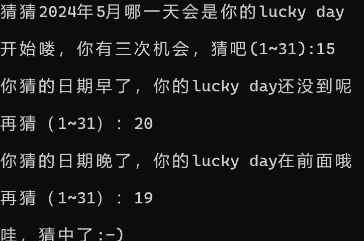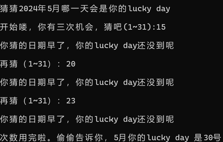 1 #include<stdio.h> 2 #include<stdlib.h> 3 #include<time.h> 4 int main() 5 { 6 int n,m,i; 7 srand(time(0)); 8 n=rand()%31+1; 9 printf("猜猜2024年5月哪一天会是你的lucky day\n\n"); 10 printf("开始喽,你有三次机会,猜吧(1~31):"); 11 for(i=1;i<4;++i) 12 { 13 scanf("%d",&m); 14 printf("\n"); 15 if(m==n) 16 { 17 printf("哇,猜中了:-)\n"); 18 break; 19 } 20 if(m<n) 21 printf("你猜的日期早了,你的lucky day还没到呢\n\n"); 22 if(m>n) 23 printf("你猜的日期晚了,你的lucky day在前面哦\n\n"); 24 if(i==3) 25 { 26 printf("次数用完啦。偷偷告诉你,5月你的lucky day 是%d号\n",n); 27 break; 28 } 29 printf("再猜(1~31):"); 30 } 31 32 system("pause"); 33 return 0; 34 }
