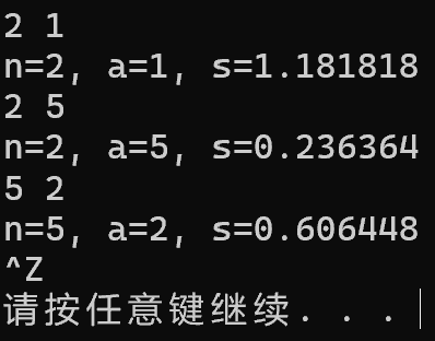 1 #include<stdio.h> 2 #include<stdlib.h> 3 int main() 4 { 5 int n,i,a,m; 6 double s; 7 while(scanf("%d%d",&n,&a)!=EOF) 8 { 9 for(i=1,m=0,s=0;i<=n;++i) 10 { 11 m=m*10+a; 12 s+=1.0*i/m; 13 } 14 printf("n=%d, a=%d, s=%lf",n,a,s); 15 } 16 system("pause"); 17 return 0; 18 }