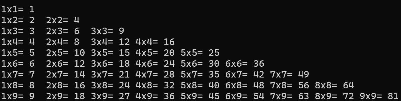 1 #include<stdio.h> 2 #include<stdlib.h> 3 int main() 4 { 5 int i,j,m; 6 for(i=1;i<10;++i) 7 { 8 for(j=1,m=1;j<=i;++j) 9 { 10 m=j*i; 11 printf("%dx%d= %d\t",j,i,m); 12 } 13 printf("\n"); 14 } 15 system("pause"); 16 return 0; 17 }