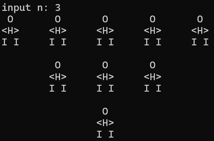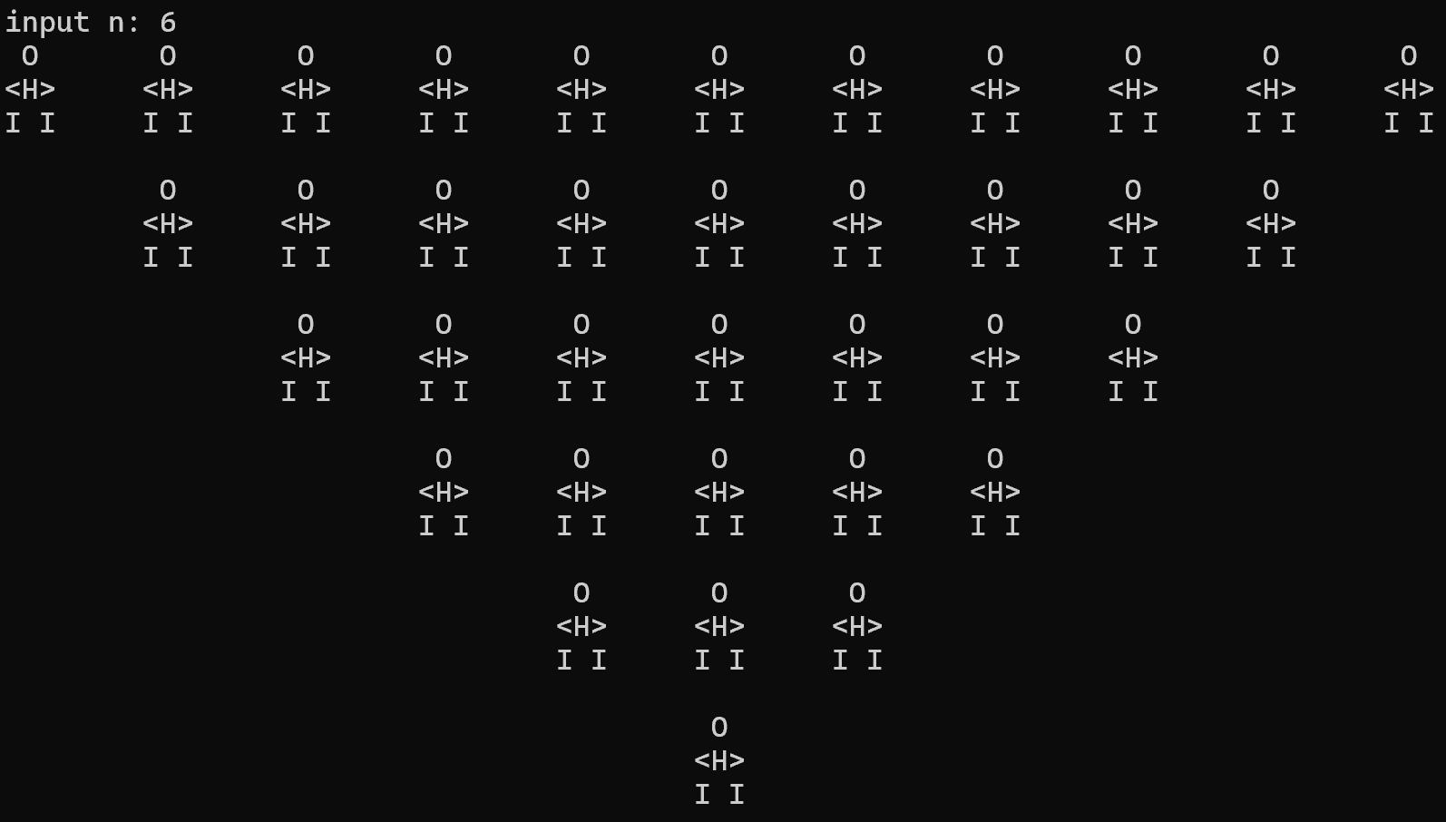 1 #include<stdio.h> 2 #include<stdlib.h> 3 int main() 4 { 5 int n,i,j,k,l; 6 printf("input n: "); 7 scanf("%d",&n); 8 for(i=n;i>=1;--i) 9 { 10 for(k=1;k<=3;++k) 11 { 12 for(j=1,l=i;j<=(2*n-1);++j,++l) 13 { 14 if(l<n) 15 printf("\t"); 16 else if(j>(n+i-1)) 17 printf("\t"); 18 else if(k==1) 19 printf(" O \t"); 20 21 else if(k==2) 22 printf("<H>\t"); 23 else if(k==3) 24 printf("I I\t"); 25 26 } 27 printf("\n"); 28 } 29 printf("\n"); 30 } 31 system("pause"); 32 return 0; 33 }