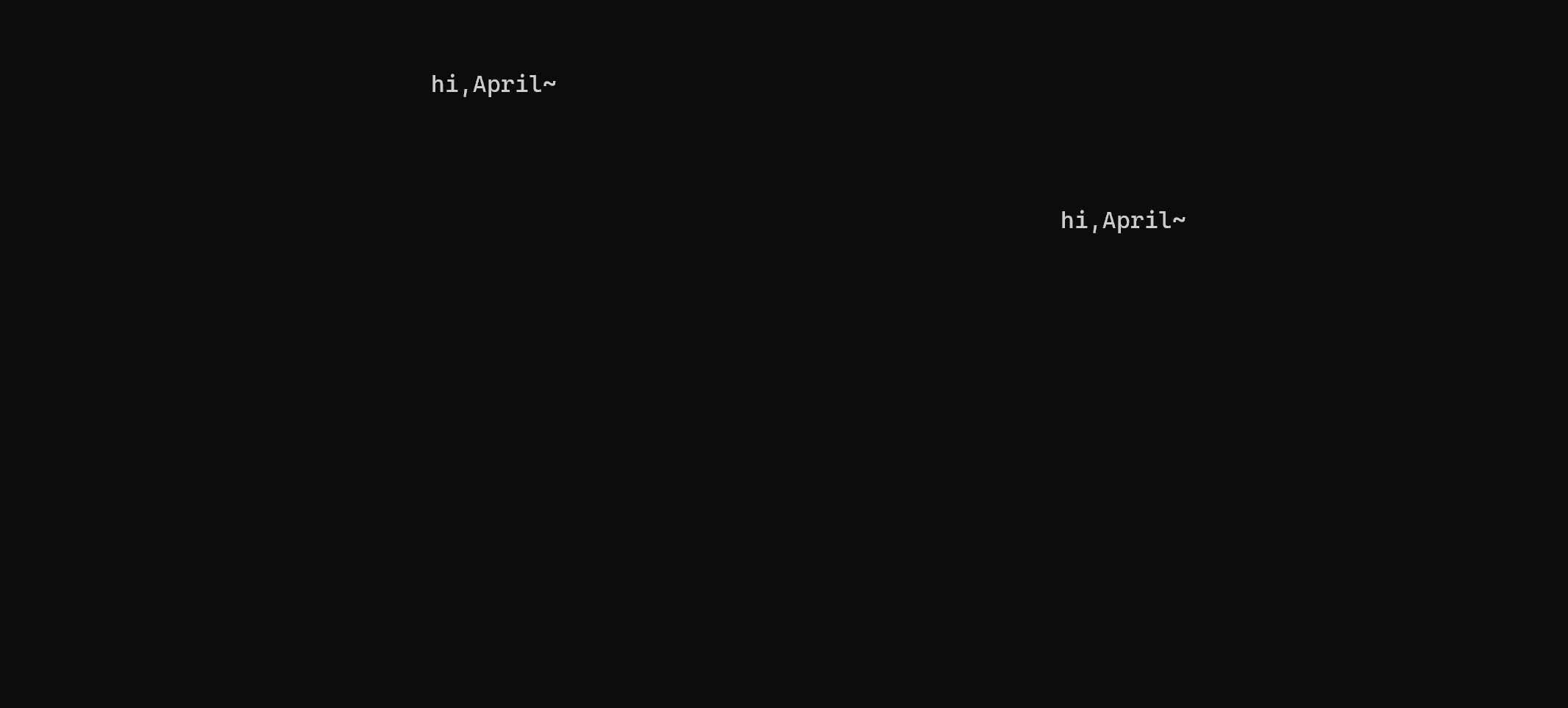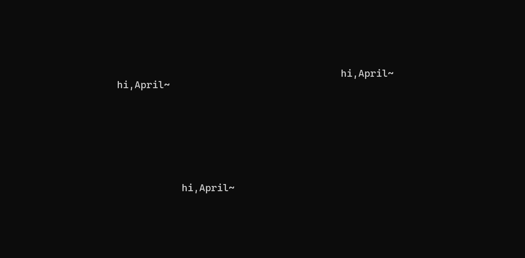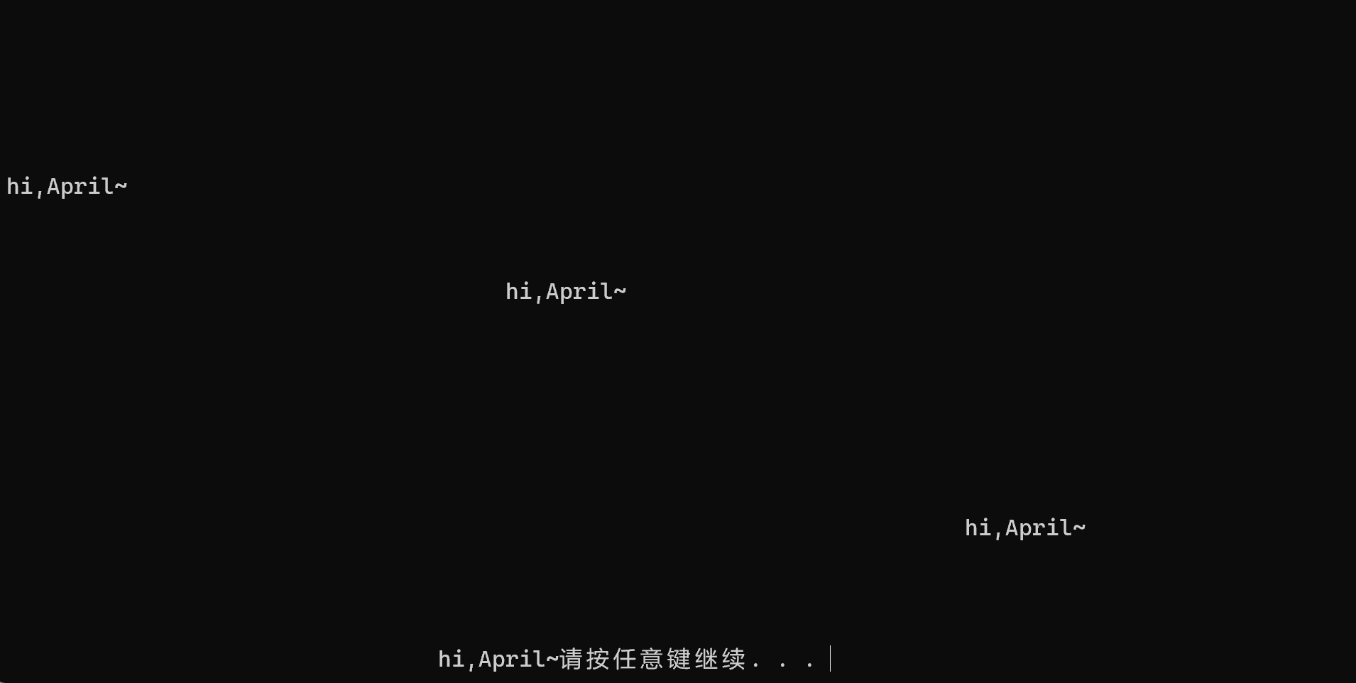1 #include<stdio.h> 2 #include<stdlib.h> 3 #include<time.h> 4 #include<windows.h> 5 #define N 80 6 7 void print_text(int line,int col,char text[]); 8 void print_spaces(int n); 9 void print_blank_lines(int n);//函数声明 10 11 int main() 12 { 13 int line,col,i; 14 char text[N]="hi,April~"; 15 16 srand(time(0));//以当前系统时间作为随机种子 17 18 for(i=1;i<=10;++i) 19 { 20 line=rand()%25; 21 col=rand()%80; 22 print_text(line,col,text); 23 Sleep(1000);//暂停1000ms 24 } 25 system("pause"); 26 return 0; 27 } 28 // 打印n个空格 29 void print_spaces(int n) { 30 int i; 31 32 for(i = 1; i <= n; ++i) 33 printf(" "); 34 } 35 36 // 打印n行空白行 37 void print_blank_lines(int n) { 38 int i; 39 40 for(i = 1; i <= n; ++i) 41 printf("\n"); 42 } 43 44 // 在第line行第col列打印一段文本 45 void print_text(int line, int col, char text[]) { 46 print_blank_lines(line-1); // 打印(line-1)行空行 47 print_spaces(col-1); // 打印(col-1)列空格 48 printf("%s", text); // 在第line行、col列输出text中字符串 49 } 50 //功能:随机在第m行第n列打印输出一段文字(0<m<24,0<n<79),输完一次,暂停1秒,循环10次