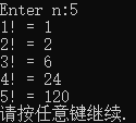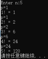 1 #include<stdio.h> 2 #include<stdlib.h> 3 long long fac(int n); 4 5 int main() 6 { 7 int i,n; 8 9 printf("Enter n:"); 10 scanf("%d",&n); 11 12 for(i=1;i<=n;++i) 13 printf("%d! = %lld\n",i,fac(i)); 14 15 system("pause"); 16 return 0; 17 } 18 long long fac(int n) 19 { 20 static long long p=1;//静态局部变量:保留上次结果 21 printf("p=%lld\n",p); 22 p=p*n; 23 24 return p; 25 }