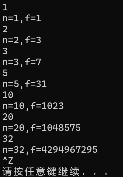 1 #include<stdio.h> 2 #include<stdlib.h> 3 long long func(int n); 4 int main() 5 { 6 int n; 7 long long f; 8 while(scanf("%d",&n)!=EOF) 9 { 10 f=func(n); 11 printf("n=%d,f=%lld\n",n,f); 12 } 13 system("pause"); 14 return 0; 15 } 16 17 long long func(int x) 18 { 19 long long ans=0; 20 21 if(x==1) 22 ans=1; 23 24 if(x>0&&x<33) 25 ans=2*func(x-1)+1; 26 27 return ans; 28 }