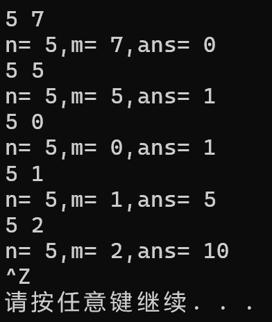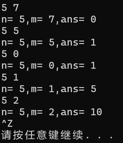 1 #include<stdio.h> 2 #include<stdlib.h> 3 int func(int n,int m); 4 int main() 5 { 6 int n,m; 7 8 while(scanf("%d%d",&n,&m)!=EOF) 9 printf("n= %d,m= %d,ans= %d\n",n,m,func(n,m)); 10 11 system("pause"); 12 return 0; 13 }