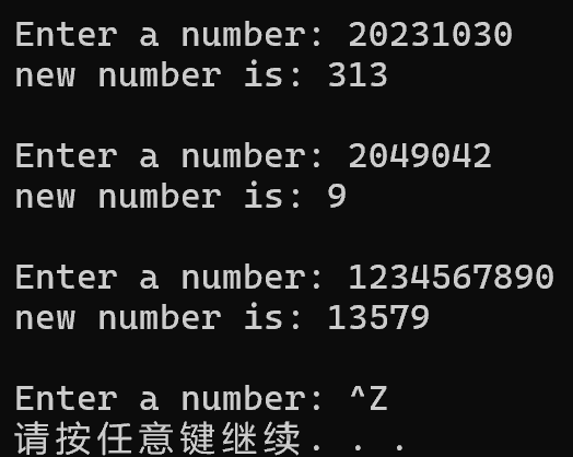 1 #include<stdio.h> 2 #include<stdlib.h> 3 long func(long s); 4 int main() 5 { 6 long s, t; 7 8 printf("Enter a number: "); 9 while (scanf("%ld", &s) != EOF) { 10 t = func(s); // 函数调用 11 printf("new number is: %ld\n\n", t); 12 printf("Enter a number: "); 13 } 14 15 system("pause"); 16 return 0; 17 } 18 long func(long s) 19 { 20 int i=1,m=0,j=1; 21 while(s!=0) 22 { 23 i=s%10; 24 if(i%2!=0) 25 { 26 m=m+i*j; 27 j=j*10; 28 29 } 30 s=s/10; 31 } 32 33 return m; 34 }