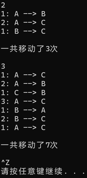 1 #include<stdio.h> 2 #include<stdlib.h> 3 #include<math.h> 4 void plate(char from,char to,char temp ,unsigned int n,int *p); 5 void trans(char from,char to,unsigned int n,int *p); 6 int main() 7 { 8 unsigned int n; 9 while(scanf("%d",&n)!=EOF) 10 { 11 int s=0; 12 plate('A','C','B',n,&s); 13 printf("\n一共移动了%d次\n\n",s); 14 } 15 system("pause"); 16 return 0; 17 } 18 void plate(char from,char to,char temp ,unsigned int n,int *p) 19 { 20 if(n==1) 21 trans(from,to,n,p); 22 else 23 { 24 plate(from,temp,to,n-1,p); 25 trans(from,to,n,p); 26 plate(temp,to,from,n-1,p); 27 } 28 29 } 30 void trans(char from,char to,unsigned int n,int *p) 31 { 32 printf("%d: %c --> %c\n",n,from,to); 33 *p=*p+1; 34 }
