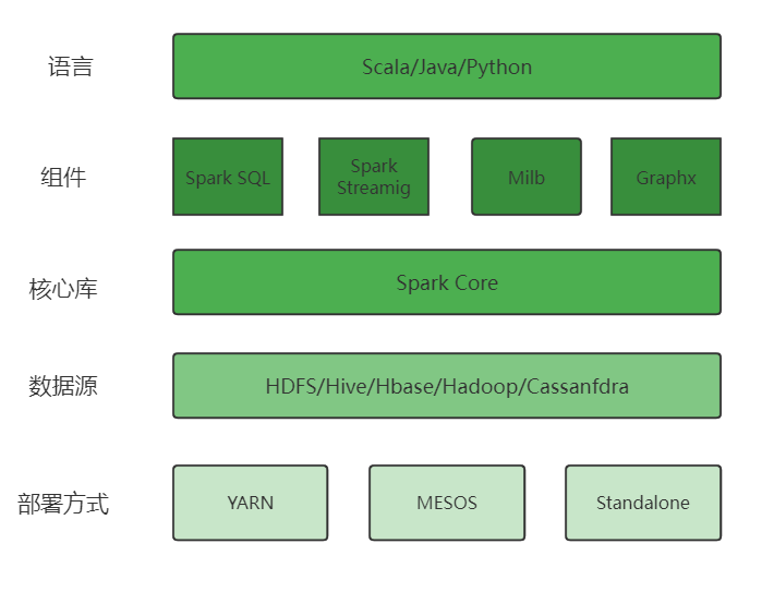 Spark生态圈以Spark Core为核心,从HDFS、Hive、HBase和Hadoop等s数据源读取数据,以MESOS、YARN和自身携带的Standalone为资源管理器调度Job完成Spark应用程序的计算。 这些应用程序可以来自于不同的组件,如Spark Streaming的实时处理应用、Spark SQL的即席查询、Mlib的机器学习、GraphX的图处理等等。