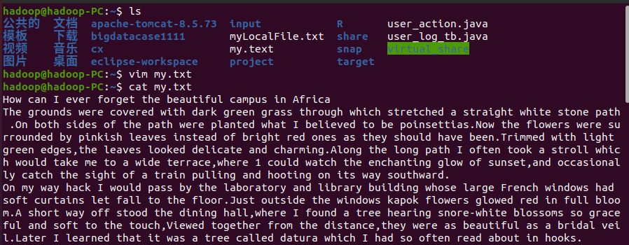 >>> lines = sc.textFile("file:///home/hadoop/my.txt")