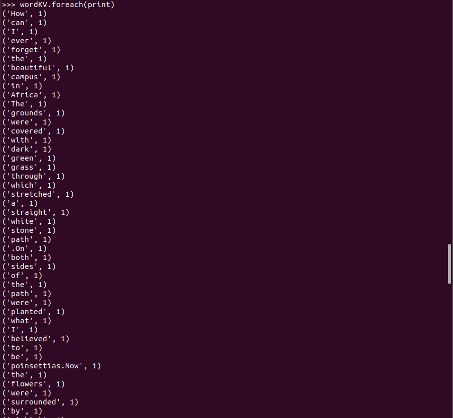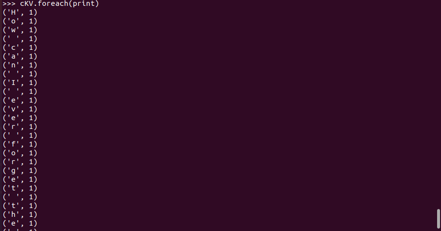 >>> wordKV.foreach(print)