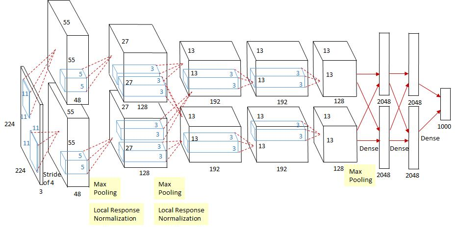- 每层卷积将使用ReLU作为激活函数,在全连接层后添加dropout来抑制过拟合