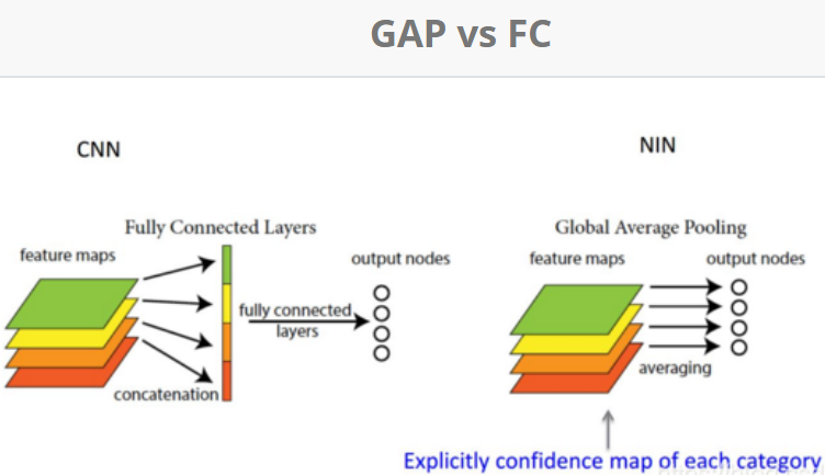 GAP:计算每张特征图所有像素点的均值,n个特征图组成n*1特征向量,就可以softmax分类计算