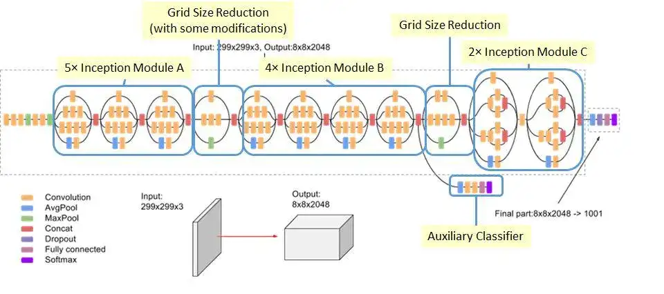 Inception-v3网络结构如下,较早的层采用模块A,中间层采用模块B,而后面层采用模块C。Inception-v3的默认输入大小是229x229。