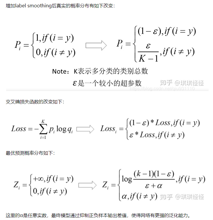 Label Smoothing主要理念是防止最大的logit远大于其它logits,因为可能会导致过拟合。具体实现通过改变one-hot编码的label即可。其中K是类别数,而ε=0.1是一个超参数。