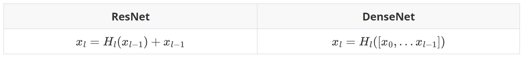 - 随着网络加深,输入信息和梯度信息在很多层之间传递导致愈加明显的梯度消失问题\({\to}\)保证网络层与层之间最大程度的信息传输的前提下,使每层的输入来自前面所有层的输出(共L(L+1)/2个连接),dense connection相当于每一层都直接连接input和loss,特征和梯度的传递更加有效,减轻vanishing-gradient,网络更容易训练。