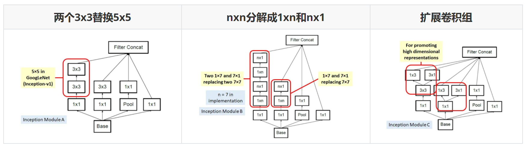 引入核心理念“因子化”(Factorization),将一些较大的卷积核分解成几个较小的卷积核,参数数量减少但感受野等价。