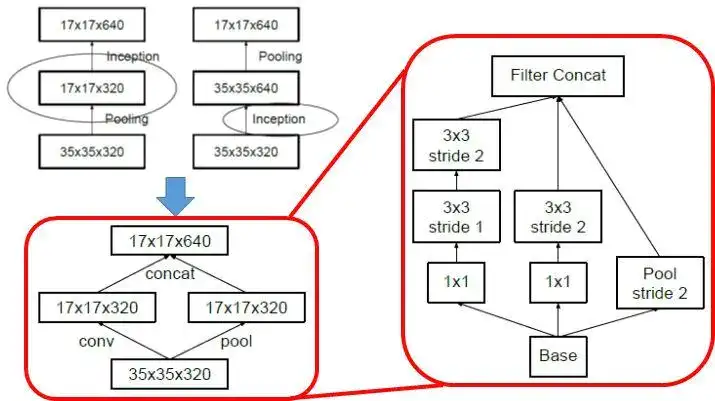 Inception-v3的另外的一个改进是不再直接使用max pooling层进行下采样,因为这样导致信息损失较大。一个可行方案是先进行卷积增加特征channel数量,然后进行pooling,但是计算量较大。所以作者设计了另外一种方案,即两个并行的分支,一个是pooling层,另外一个卷积层,最后将两者结果concat在一起。这样在使用较小的计算量情形下还可以避免瓶颈层,这种策略其实在ShuffleNet网络中也采用了。