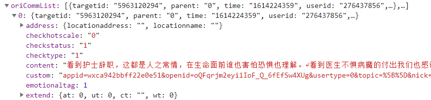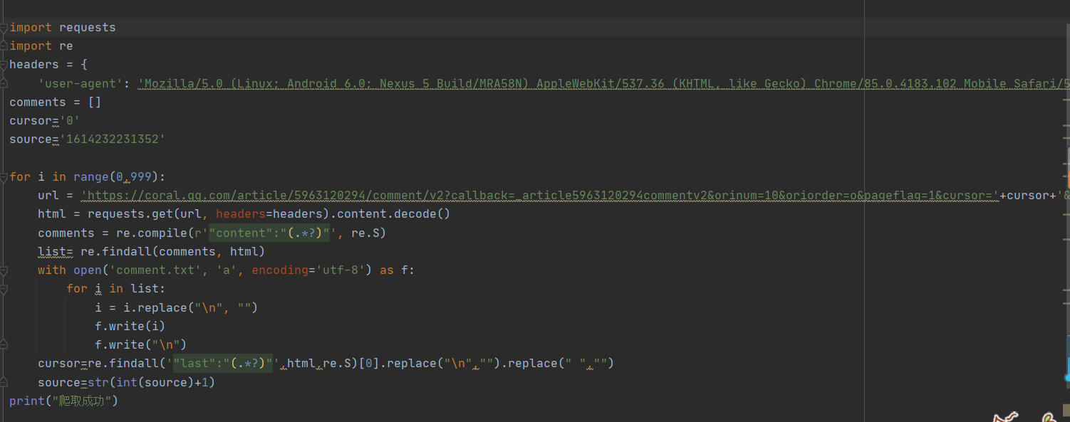 上学期我爬虫学的不太行而且过了这么久很多知识都忘了所以只能先去复习了一下,之后我就选择的是完成作业一采集腾讯视频里电视剧《在一起》的全部评论信息,因为作业二好像有点难,首先进入腾讯视频找到电视剧《在一起》的影评广场,F12查看源代码后通过观察网页的url发现每一页的url只有cursor和source后的数字不同,发现规律后即可爬取代码中的内容我们所需要的内容在content中所以只要爬取这一部分即可。