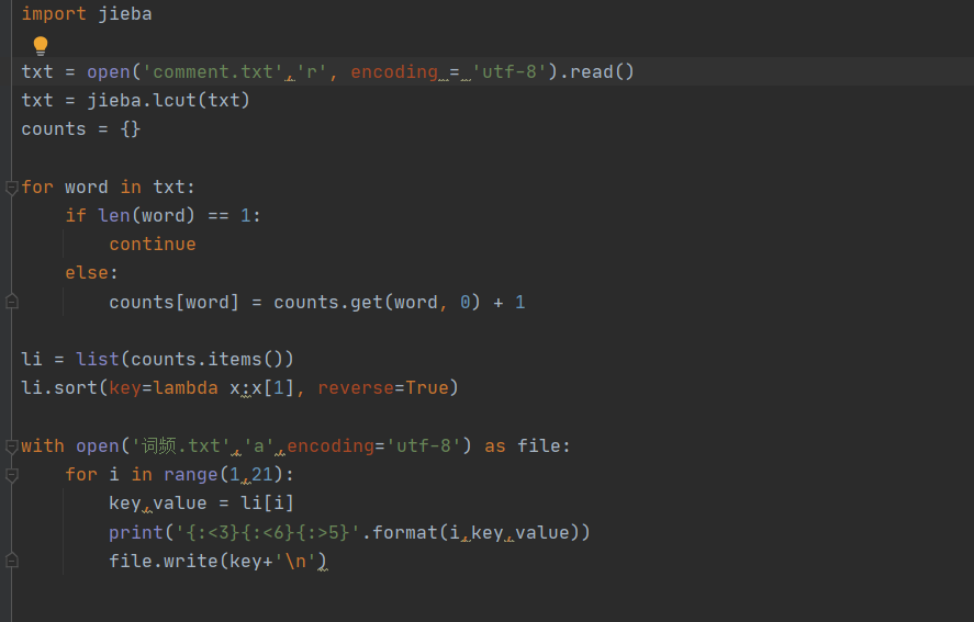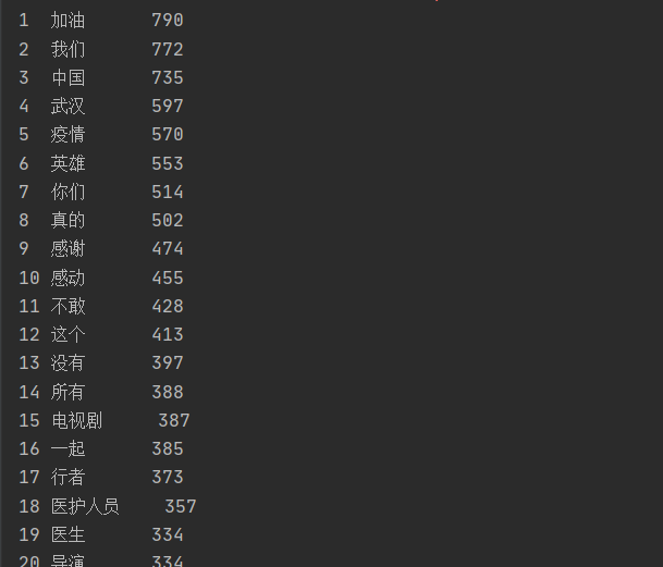 一开始我都不知道该如何进行这一步,通过查看了其他人的作业发现都是用了jieba库来完成的,后来通过询问同学才知道如何操作和使用jieba库,先在pycharm中下载了jieba库再通过读取之前爬取的结果统计出了高频词和出现的次数