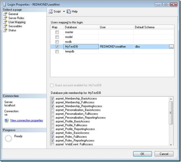 创建过登录名,还需要将登录名映射到数据库用户的合适的角色。例如,为了验证用户(authenticate),需要aspnet_Membership_BasicAccess角色;如果要创建新用户,还需要aspnet_Membership_FullAccess角色(见下图)。