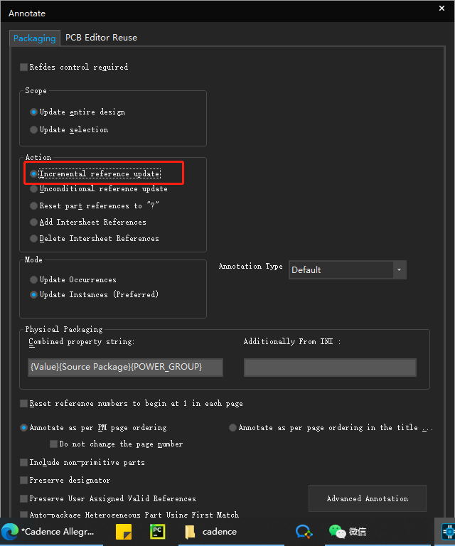 ③、执行菜单栏命令“Tools”→“Annotate”,在弹出的“Annotate”对话框“Action”一 栏中选择“Incremental reference update”选项,如下图,如图 5-106 所示,单击“确定”按钮,重新编排 器件位号。