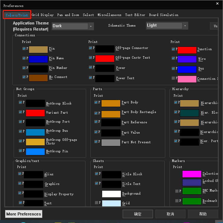 2、打开参数属性设置对话框以后,会弹出如图下图所示的界面,选择“Colors/Print”选项,这个界面是对各个属性参数的颜色进行设置,以及打印 PDF 是否需要输出。