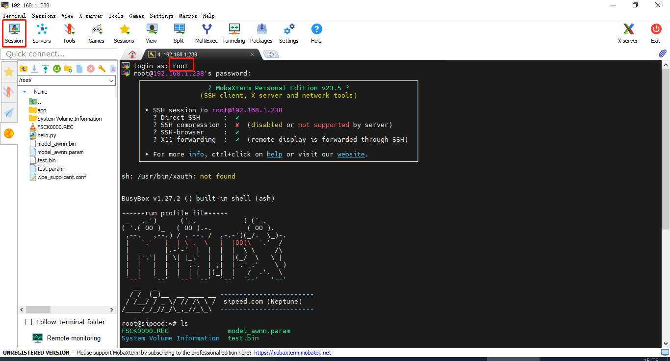 ③、通过MobaXterm软件的SSH连接终端(配置对应的IP:192.168.1.238)--电脑也要连上这WIFI,保证在局域网内。