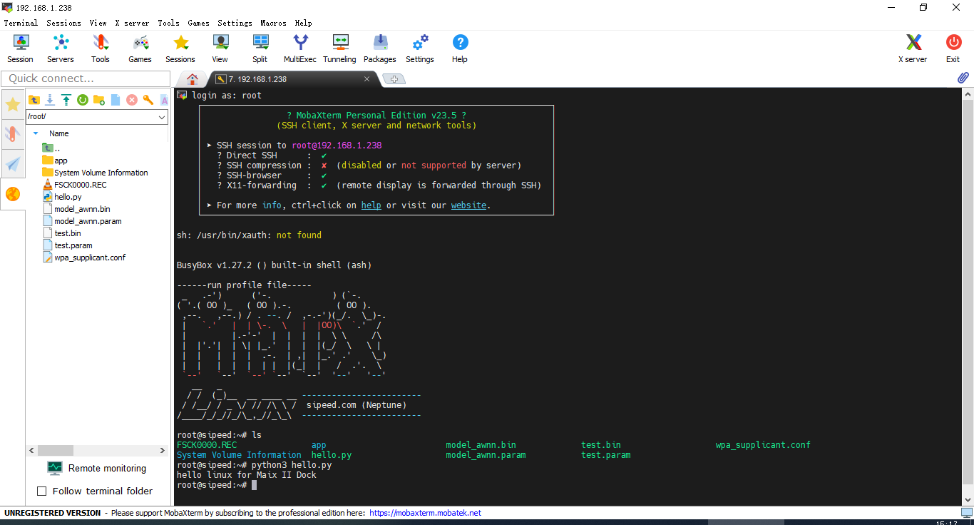 ⑥、进入/root 文件路径,创建一个hello.py文件(vim hello.py 并输入 print("hello linux for Maix II Dock"))