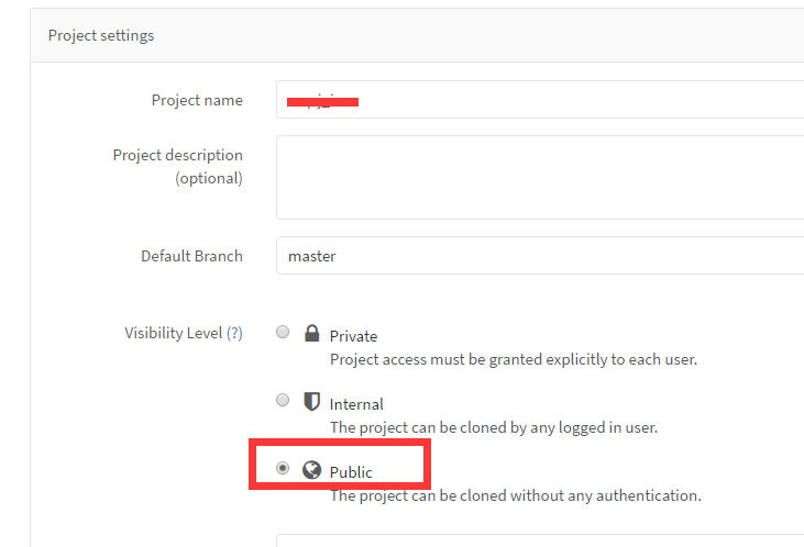 这种方式要求project在创建的时候只能选择“Public”公开状态,Private和Internal私有模式下不能使用http方式进行连接。(ssh方式在三种模式下都可以)。使用http方式直接连接gitlab显然没有ssh连接方式安全,但是也可以做些安全设置,比如在gitlab本机的iptables里做端口限制(如上是8081端口),添加白名单等