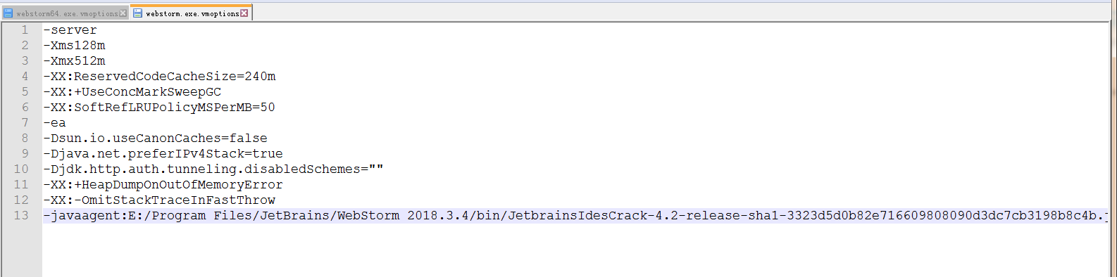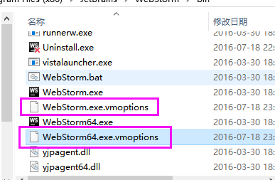 6、打开的补丁加入到WebStorm.exe.vmoptions 和WebStorm64.exe.vmoption这两个文件