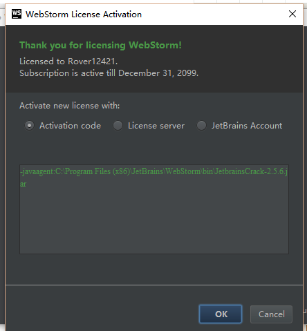 7、配置好之后,保存文件。在此再次启动WebStorm,选择activation code,并将-javaagent:你的WebStorm路径前缀/WebStorm/bin/破解补丁名字.jar