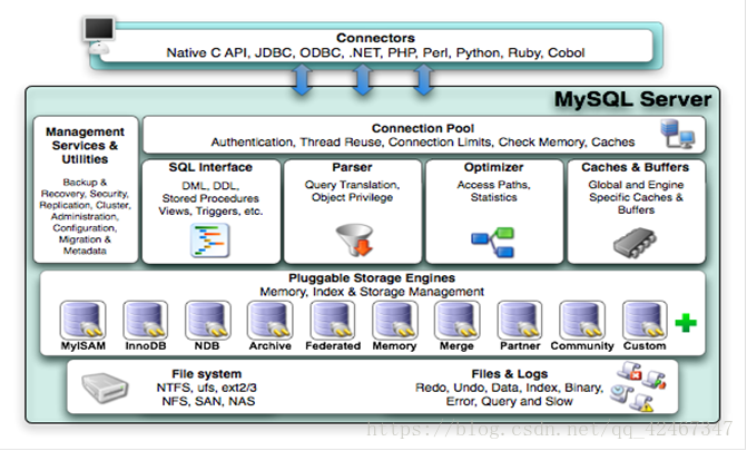 最上层是一些客户端和连接服务,包含本地的sock通信和大多数基于客户端/服务端工具实现的类似于tcp/ip的通信,主要完成一些类似于连接处理、授权认证及相关的安全方案,在该层上引用了线程池的概念,为通过认证安全接入的客户端提供线程。同样在该层上可以实现基于ssl的安全链接。服务器也会为安全接入的每个客户端验证它所具有的操作权限。