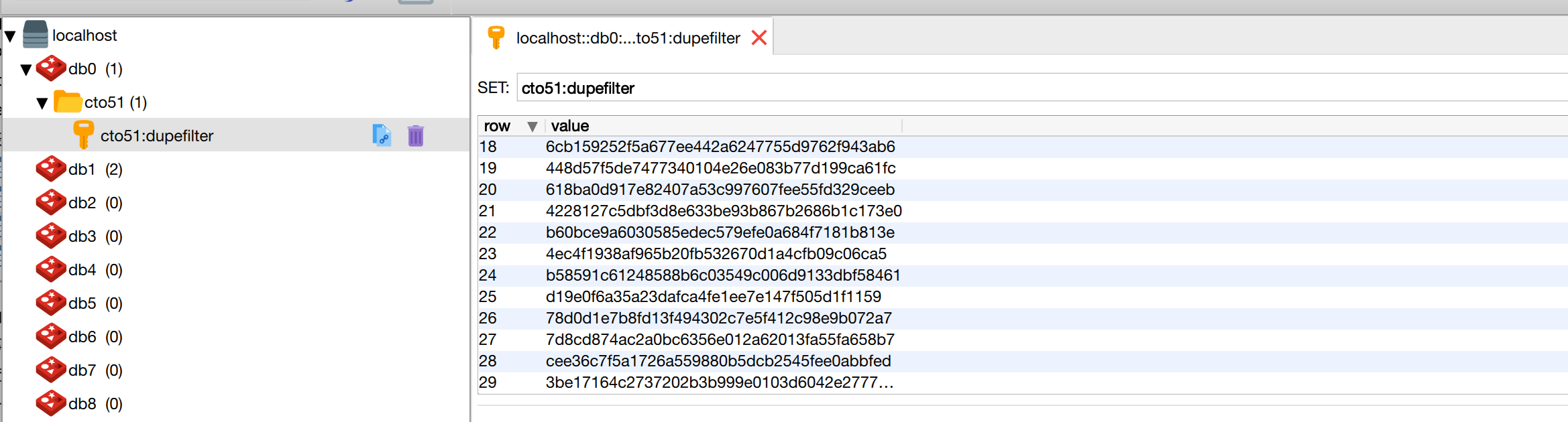 2、 “项目名:dupefilter” -->set类型,用于爬虫访问的URL去重 内容是 40个字符的 url 的hash字符串