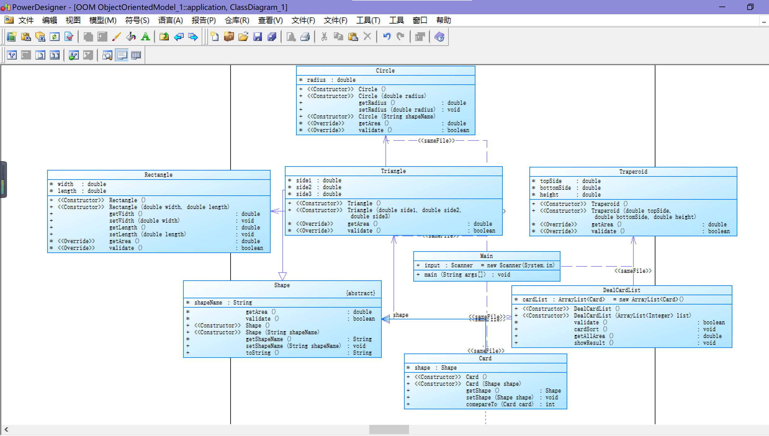 然后各图形继承Shape,在图形中重写计算图形面积的方法,并且validate方法校验图形输入的数据是否正确。所有图形内部的方法和属性写起来比较相似。最后我们还要创建一个Card类,主要的一点其实是写DealCardList类,在该类中我们要用到ArrayList泛型,这时我们就需要上网查阅一下资料。关于ArrayLIst泛型的用法。可以对其中的元素进行增删改查,这对我们存储数据有着极大的便利。接下来是我们对DealCardList类中的ArrayList的使用做些分析,其中的Card为泛型,用于设置对象的数据类型。变量设成cardList,在构造方法中将卡牌名称添加到cardList里去。