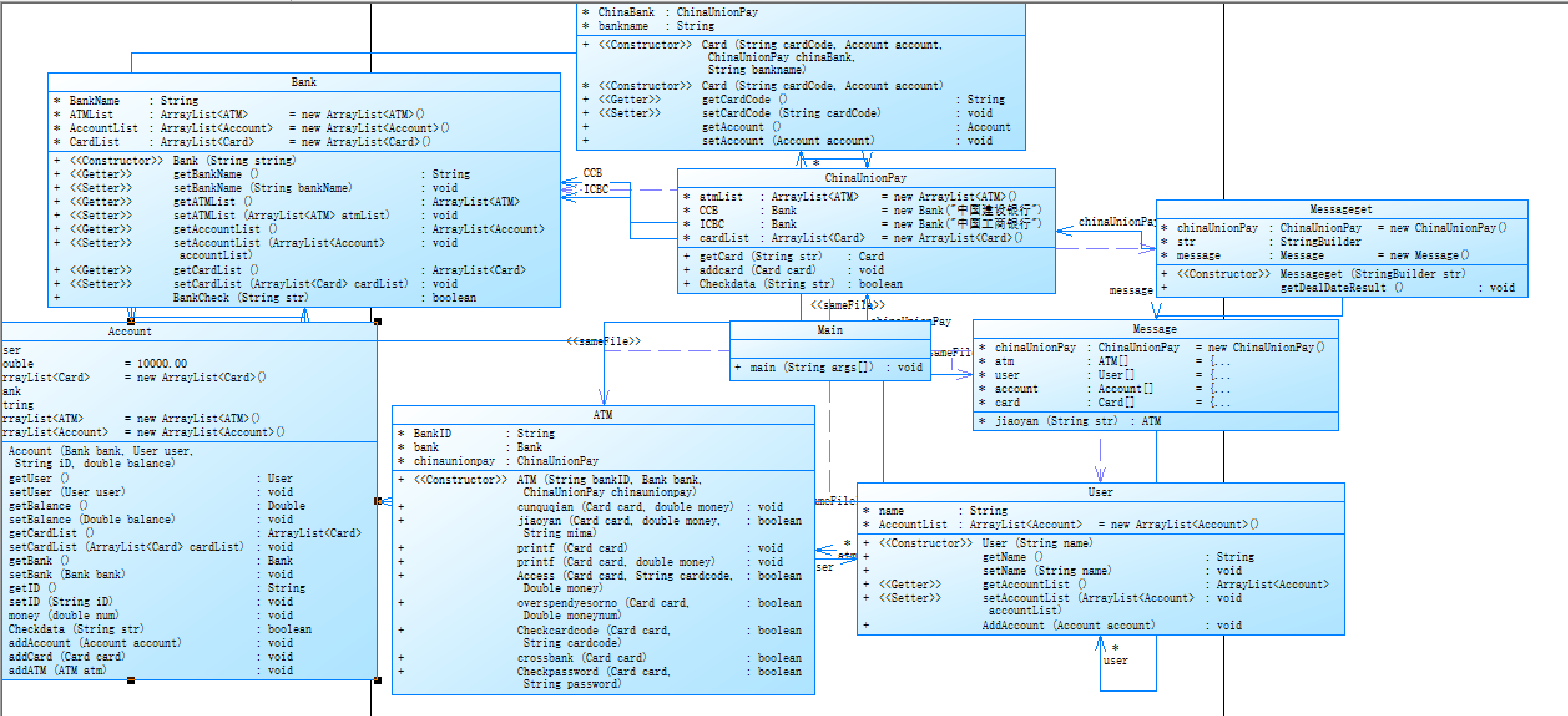 1 class Message{ 2 ChinaUnionPay chinaUnionPay = new ChinaUnionPay(); 3 ATM atm[]={ 4 new ATM("01", chinaUnionPay.CCB, chinaUnionPay), 5 new ATM("02", chinaUnionPay.CCB, chinaUnionPay), 6 new ATM("03", chinaUnionPay.CCB, chinaUnionPay), 7 new ATM("04", chinaUnionPay.CCB, chinaUnionPay), 8 new ATM("05", chinaUnionPay.ICBC, chinaUnionPay), 9 new ATM("06", chinaUnionPay.ICBC, chinaUnionPay) 10 }; 11 User user[]={ 12 new User("杨过"), 13 new User("郭靖"), 14 new User("张无忌"), 15 new User("韦小宝") 16 }; 17 Account account[] = { 18 new Account(chinaUnionPay.CCB,user[0],"3217000010041315709",10000.00), 19 new Account(chinaUnionPay.CCB,user[0],"3217000010041315715",10000.00), 20 new Account(chinaUnionPay.CCB,user[1],"3217000010051320007",10000.00), 21 new Account(chinaUnionPay.ICBC,user[1],"3222081502001312389",10000.00), 22 new Account(chinaUnionPay.ICBC,user[2],"3222081502001312390",10000.00), 23 new Account(chinaUnionPay.ICBC,user[2],"3222081502001312399",10000.00), 24 new Account(chinaUnionPay.ICBC,user[2],"3222081502051320785",10000.00), 25 new Account(chinaUnionPay.ICBC,user[3],"3222081502051320786",10000.00), 26 }; 27 Card card[] = { 28 new Card("6217000010041315709",account[0],chinaUnionPay,"中国建设银行"), 29 new Card("6217000010041315715",account[0],chinaUnionPay,"中国建设银行"), 30 new Card("6217000010041315718",account[1],chinaUnionPay,"中国建设银行"), 31 new Card("6217000010051320007",account[3],chinaUnionPay,"中国工商银行"), 32 new Card("6222081502001312389",account[4],chinaUnionPay,"中国工商银行"), 33 new Card("6222081502001312390",account[5],chinaUnionPay,"中国工商银行"), 34 new Card("6222081502001312399",account[6],chinaUnionPay,"中国工商银行"), 35 new Card("6222081502001312400",account[6],chinaUnionPay,"中国工商银行"), 36 new Card("6222081502051320785",account[7],chinaUnionPay,"中国工商银行"), 37 new Card("6222081502051320786",account[7],chinaUnionPay,"中国工商银行"), 38 }; 39 ATM jiaoyan(String str){ 40 for(ATM i:atm){ 41 if(i.BankID.equals(str)){ 42 return i; 43 } 44 } 45 return null; 46 } 47 }