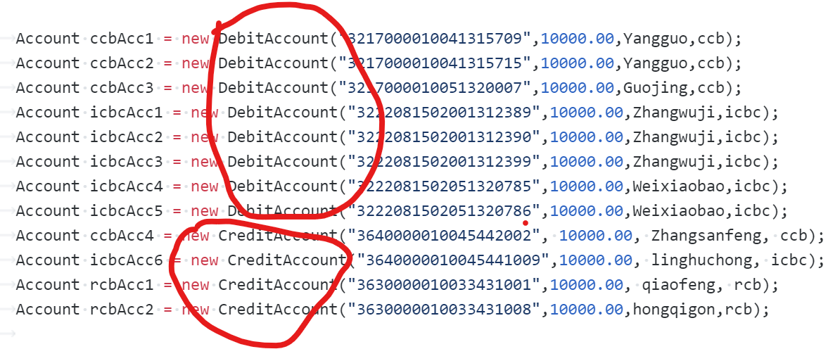 题目集9是修改老师的代码,要求我们必须看懂老师的代码。老师的代码是直接存储在了主方法中。这次需要主义的是要添加借记账户和贷记账户